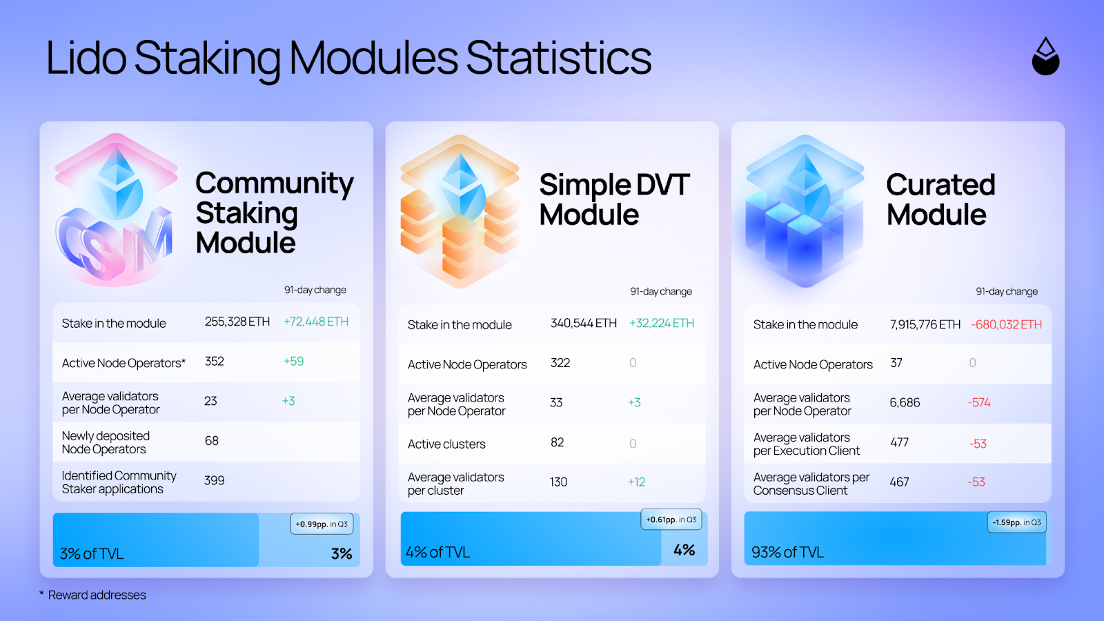 In Q3 2025, both the Simple DVT Module and the Community Staking Modules reached their respective stake share limits—4% and 3%—together accounting for roughly 600,000 staked ETH within the Lido protocol. As of October 1, 2025, these two decentralized modules represented 1.67% of the total Ethereum stake, marking continued progress toward diversifying and empowering permissionless participation in the Lido Node Operator set.