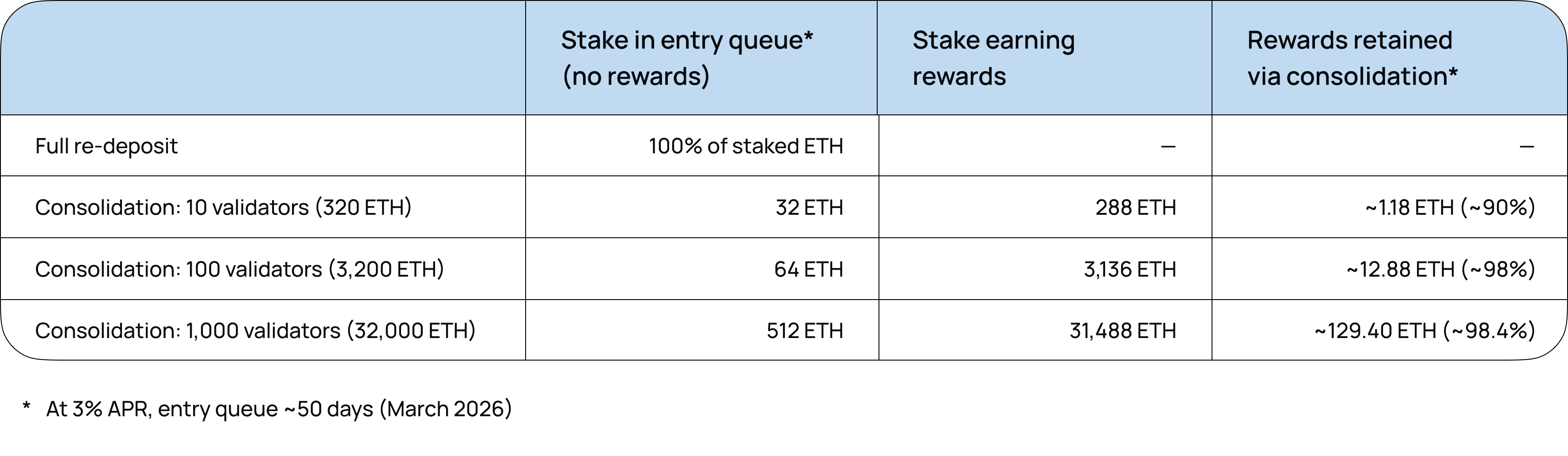 Only the initial deposit sits idle during the long entry queue. The rest of the stake keeps earning rewards while waiting for consolidation.